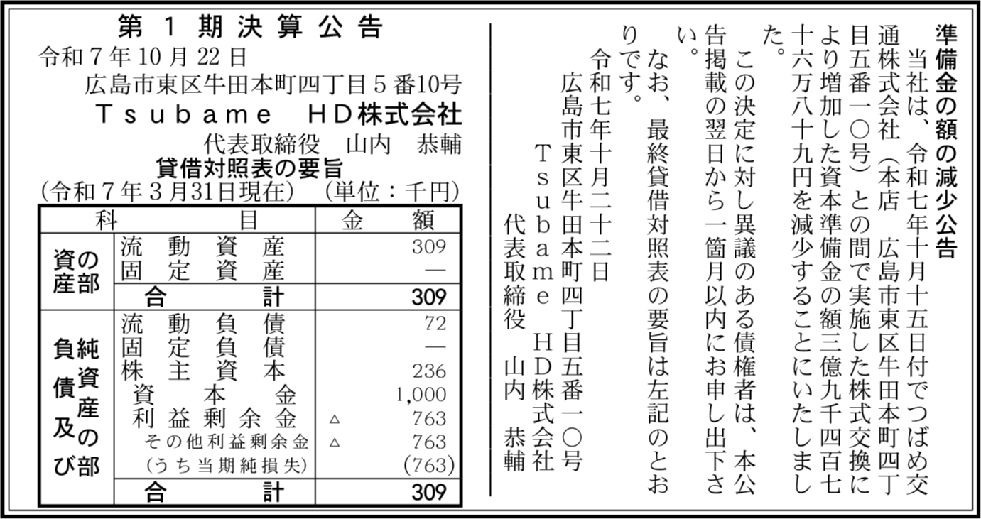 | 会社名 | Tsubame HD株式会社 |