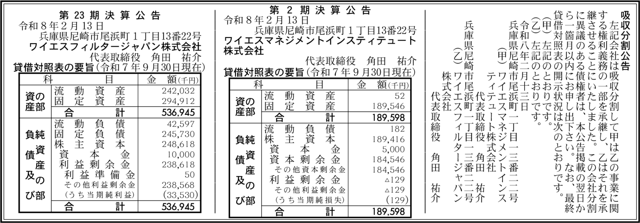 ワイエスマネジメントインスティテュート株式会社 兵庫県尼崎市 【2025年9月期】 |