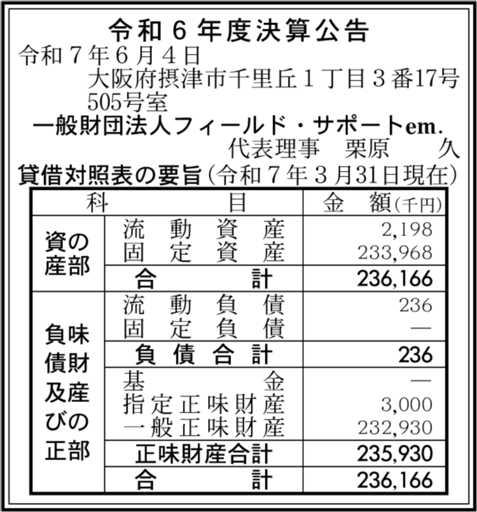 | 会社名 | 一般財団法人フィールド・サポートem. |