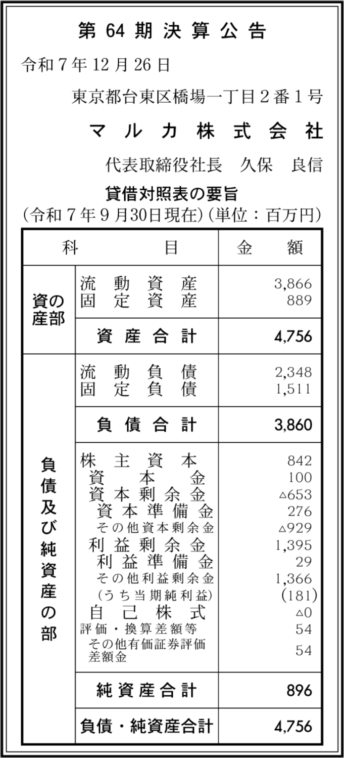 | 総資産 | 47億5,600万円 (▲14.03%) |