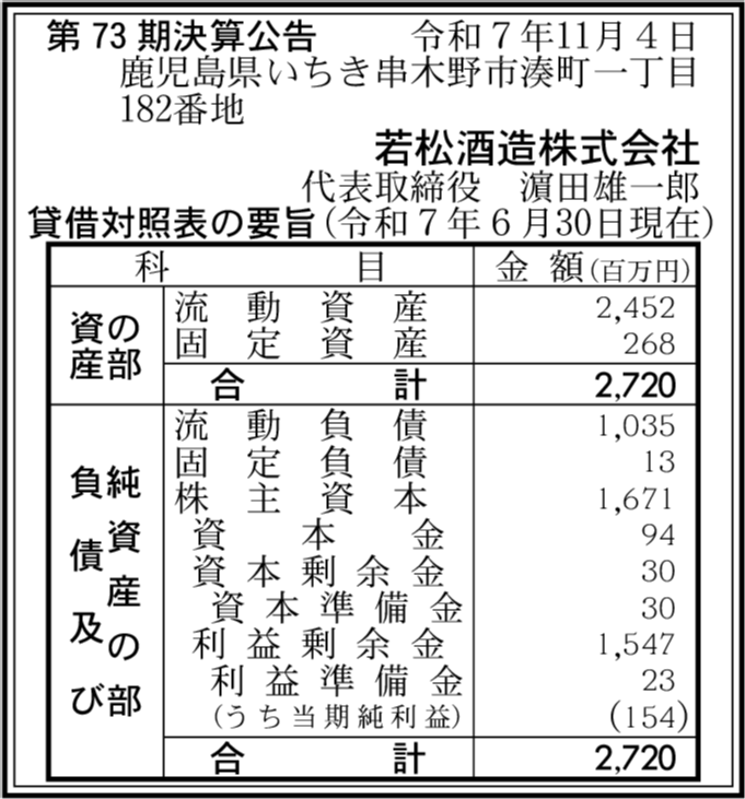 濵田酒造株式会社 鹿児島県いちき串木野市 【2025年6月期】 |