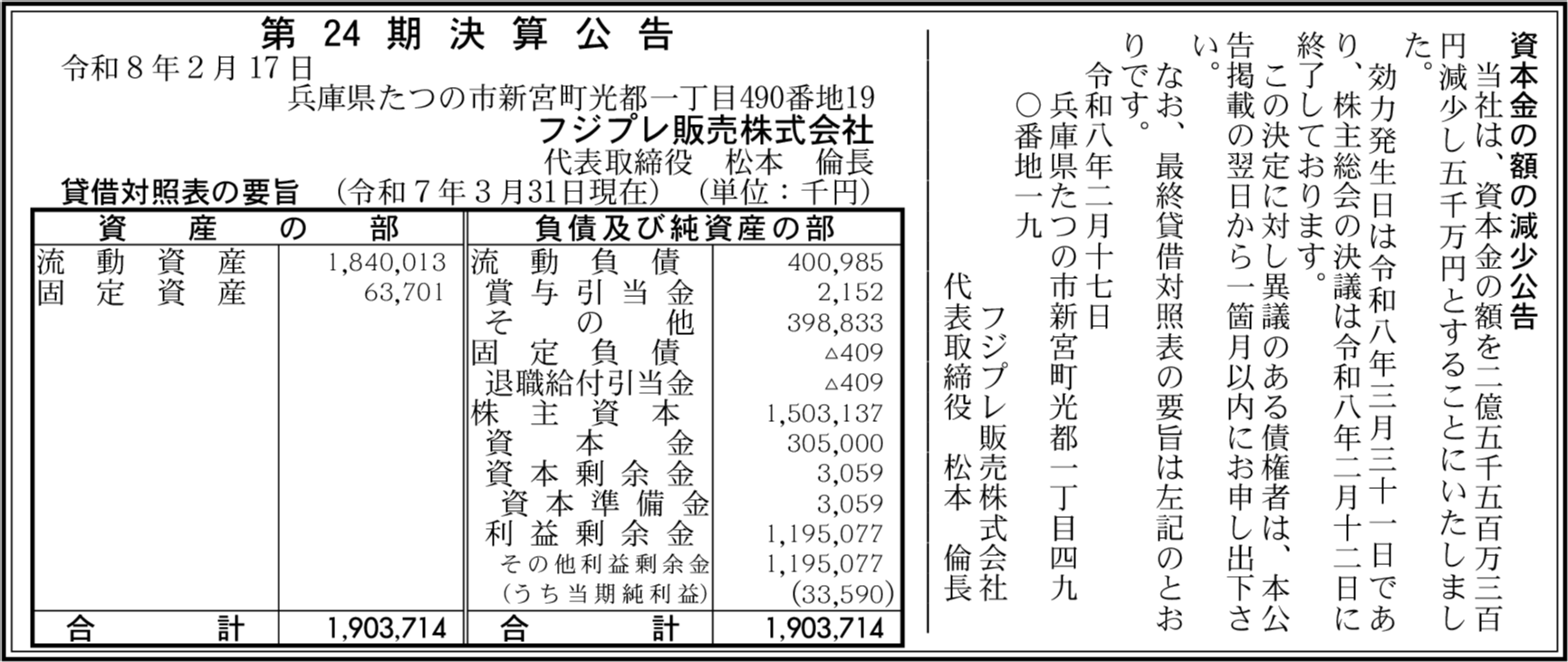 ピーシーエー株式会社閉鎖済み 兵庫県たつの市 【2025年6月期】 |