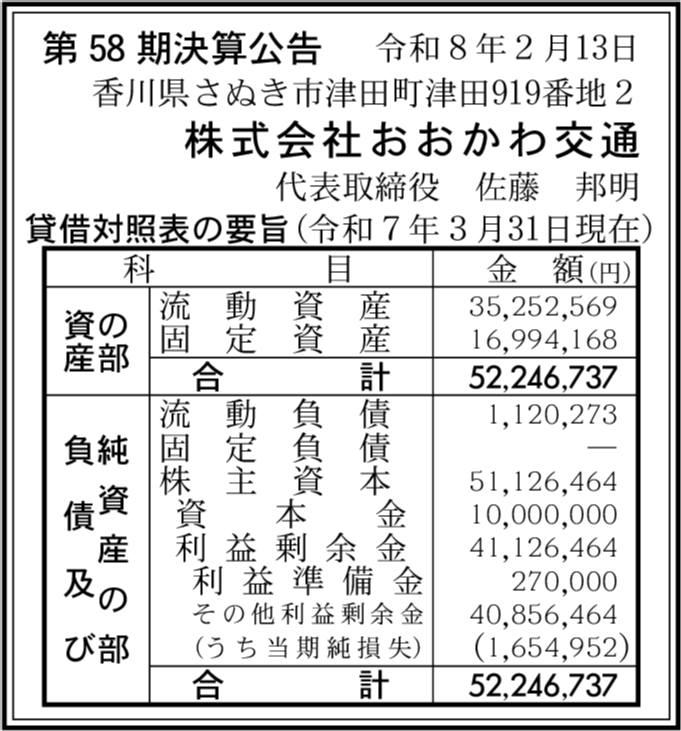 大川タクシー株式会社 香川県さぬき市 【2025年5月期】 |