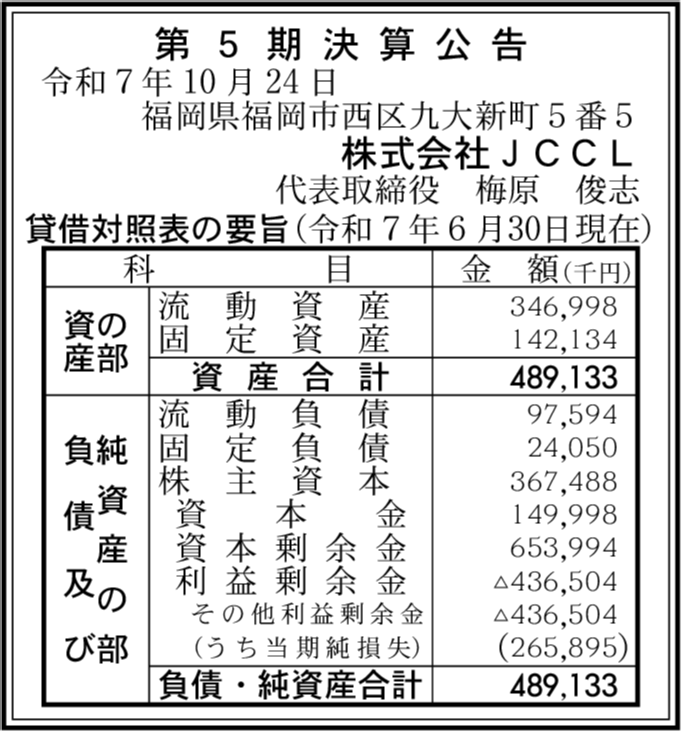 | 利益剰余金 | △4億3,650万4,000円 (赤字拡大) |