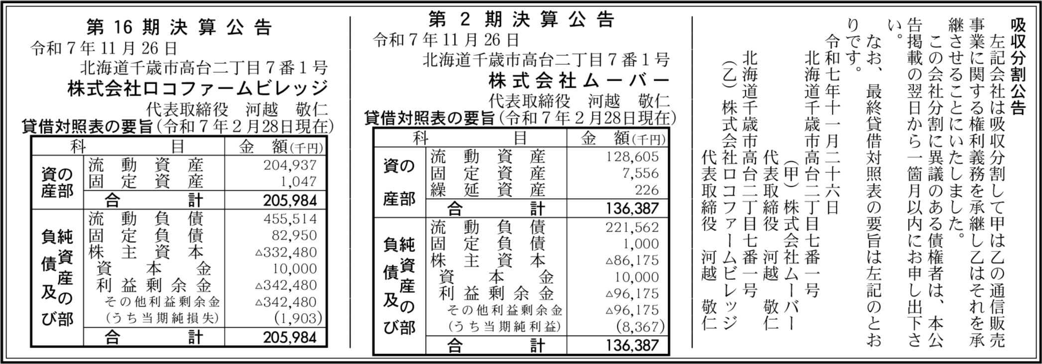 株式会社ロコファームビレッジ 北海道千歳市 【2025年2月期】 |