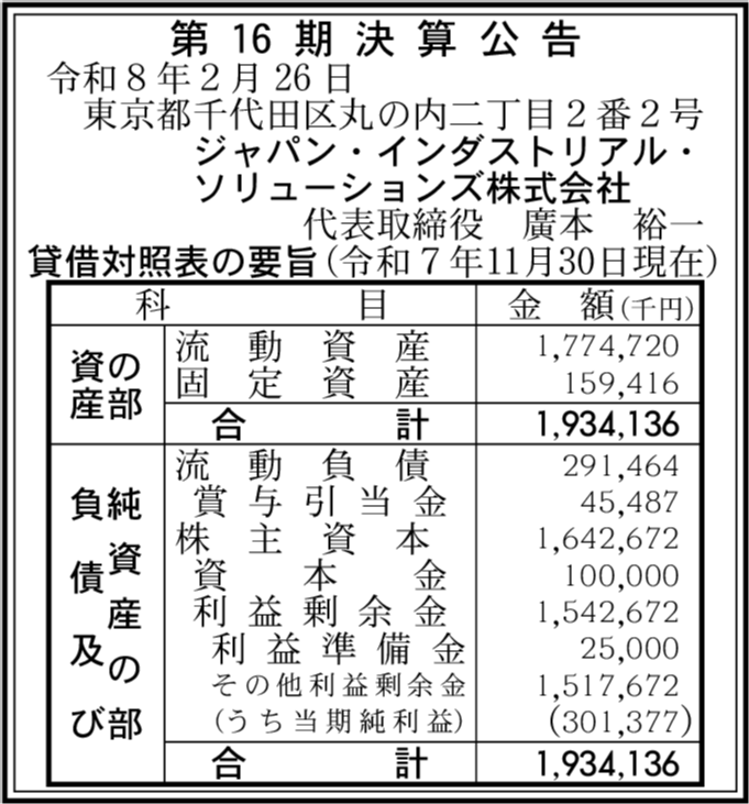 | 会社名 | ジャパン・インダストリアル・ソリューションズ株式会社 |