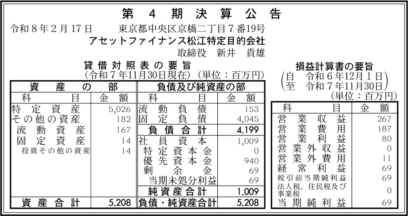 | 会社名 | アセットファイナンス松江特定目的会社 |