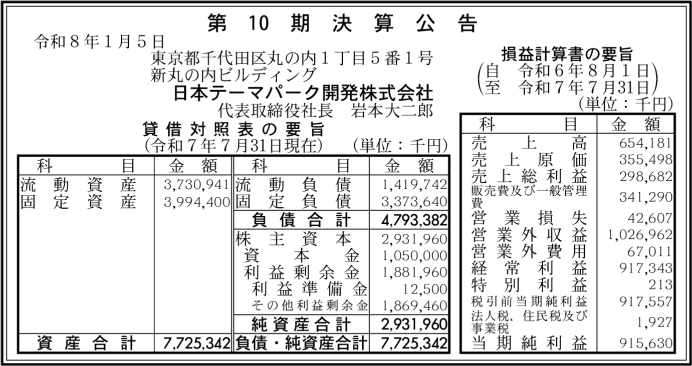 | 会社名 | 日本テーマパーク開発株式会社 |