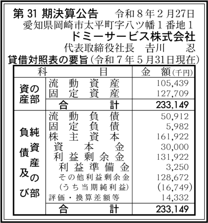ドミーデリカ株式会社 愛知県岡崎市 【2025年5月期】 |