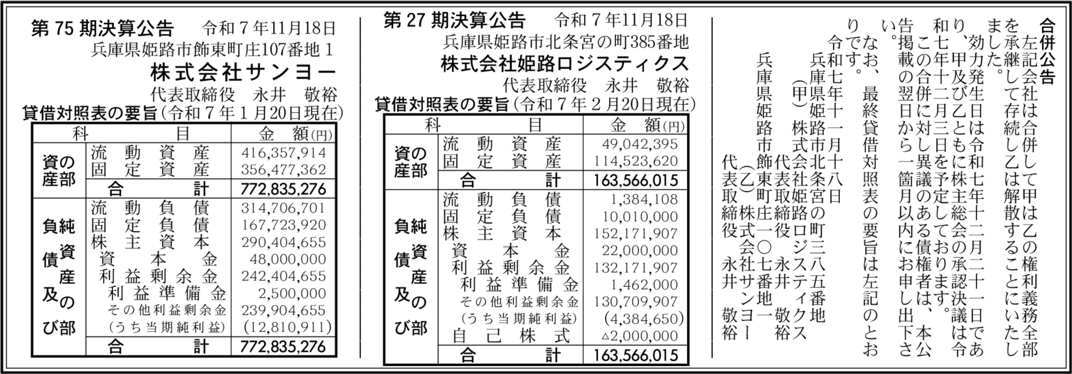 株式会社サンヨー 兵庫県姫路市 【2025年1月期】 |