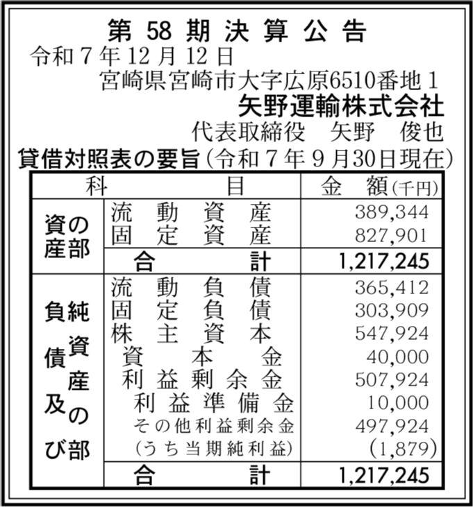 矢野産業株式会社 宮崎県東諸県郡国富町 【2025年9月期】 |