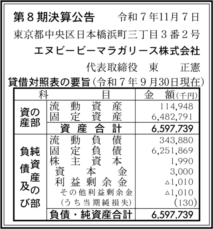 エヌビービーラッフルズプレイスリース株式会社 東京都中央区 【2025年9月期】 |