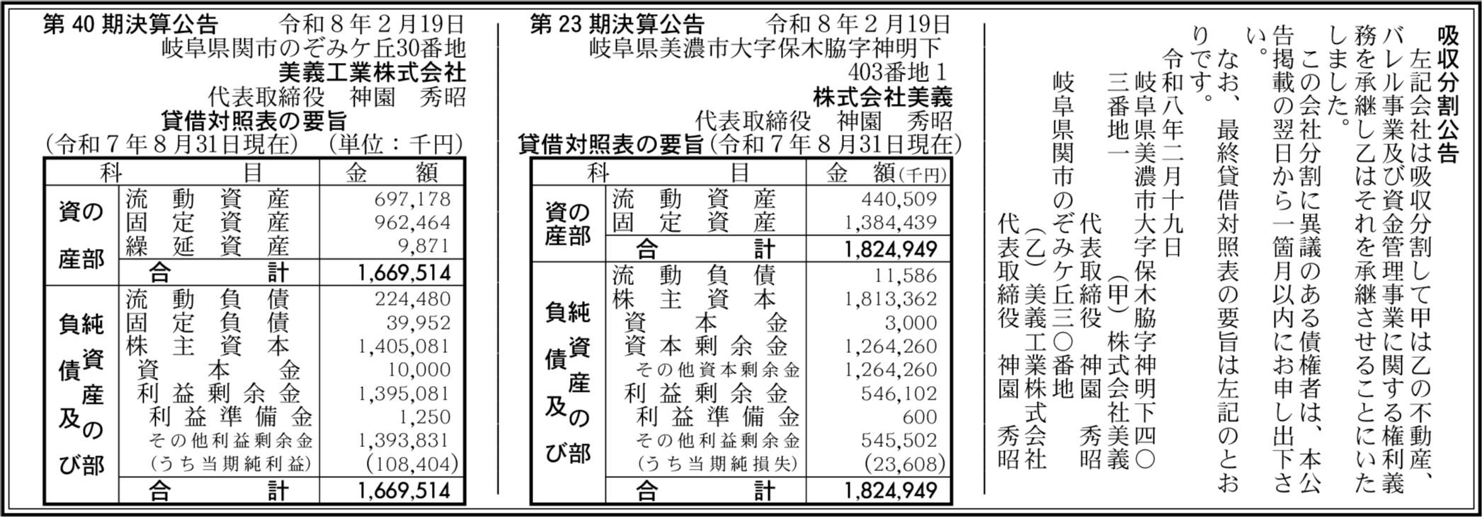 株式会社美義 岐阜県美濃市 【2025年8月期】 |