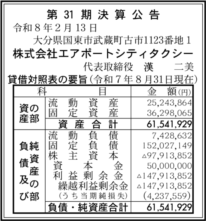 南大分シティタクシー株式会社 大分県大分市 【2025年8月期】 |