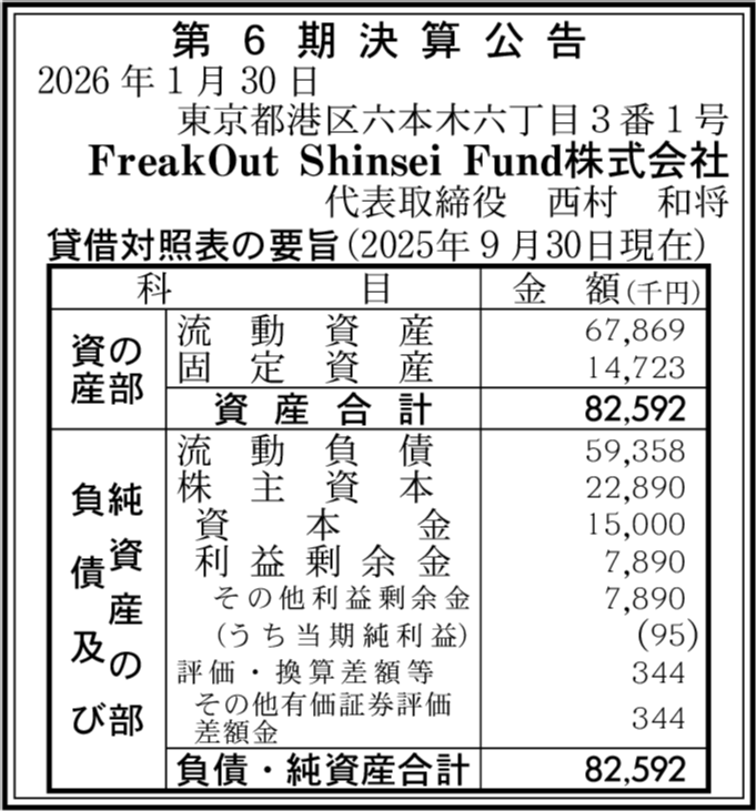 | 会社名 | FreakOut Shinsei Fund株式会社 |