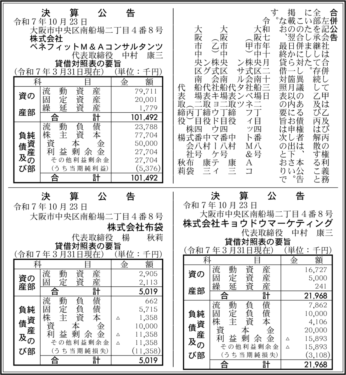株式会社ベネフィットM&Aコンサルタンツ 大阪市中央区 【2025年3月期】 |