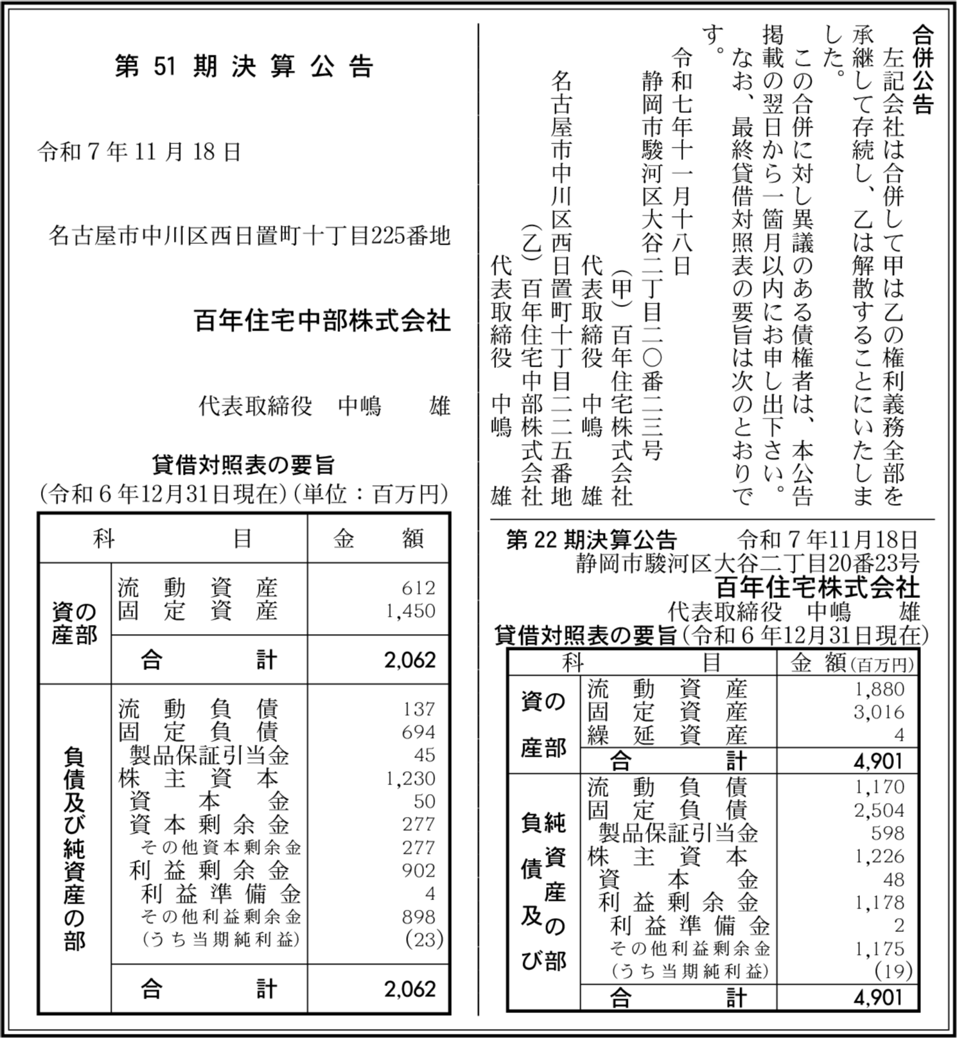 百年住宅中部株式会社 名古屋市中川区 【2024年12月期】 |
