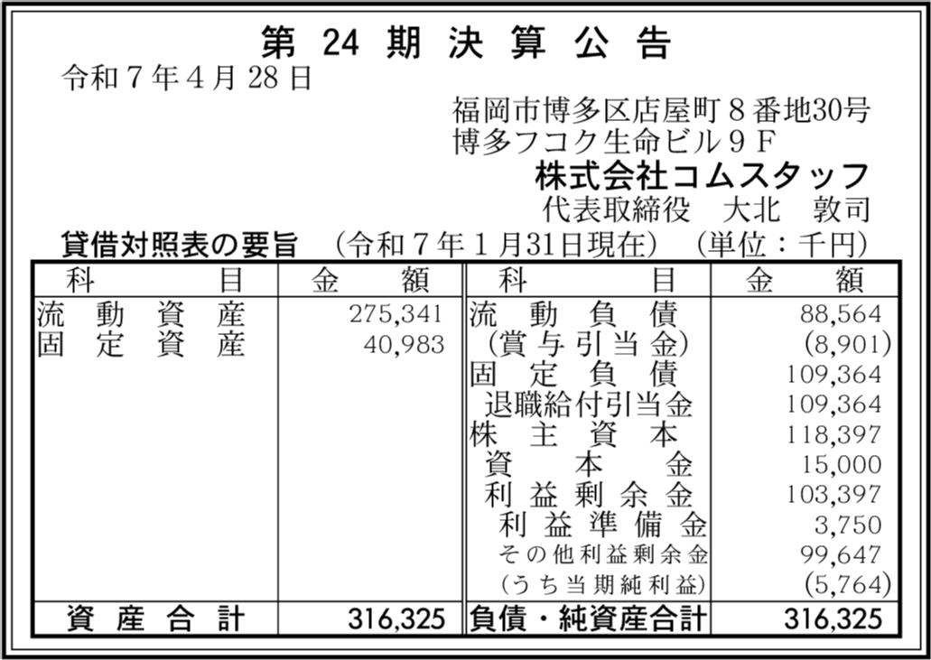 | 利益剰余金 | 1億339万7,000円 (▲0.37%) |
