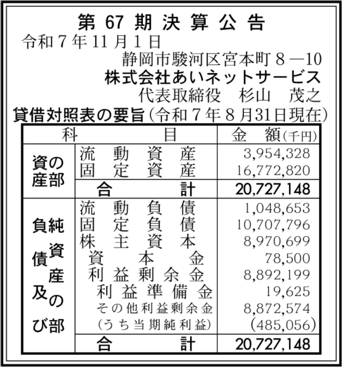 株式会社あいネット 静岡市駿河区 【2025年8月期】 |