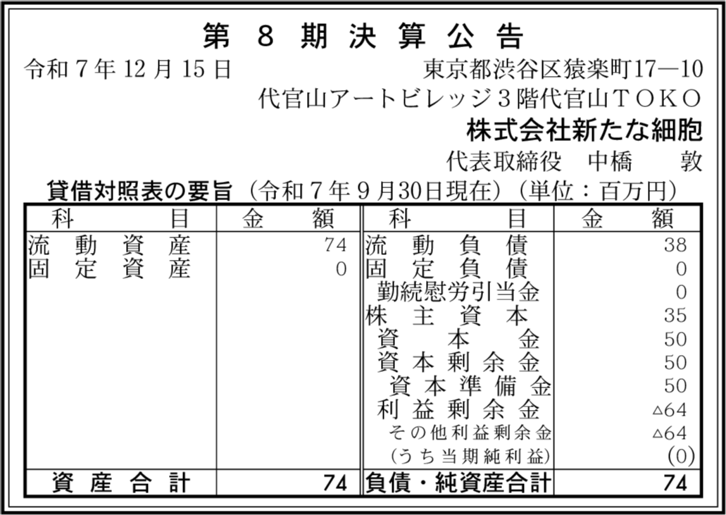 | 会社名 | 株式会社新たな細胞 |