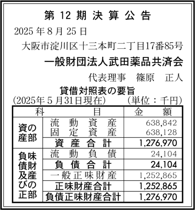 | 会社名 | 一般財団法人武田薬品共済会 |