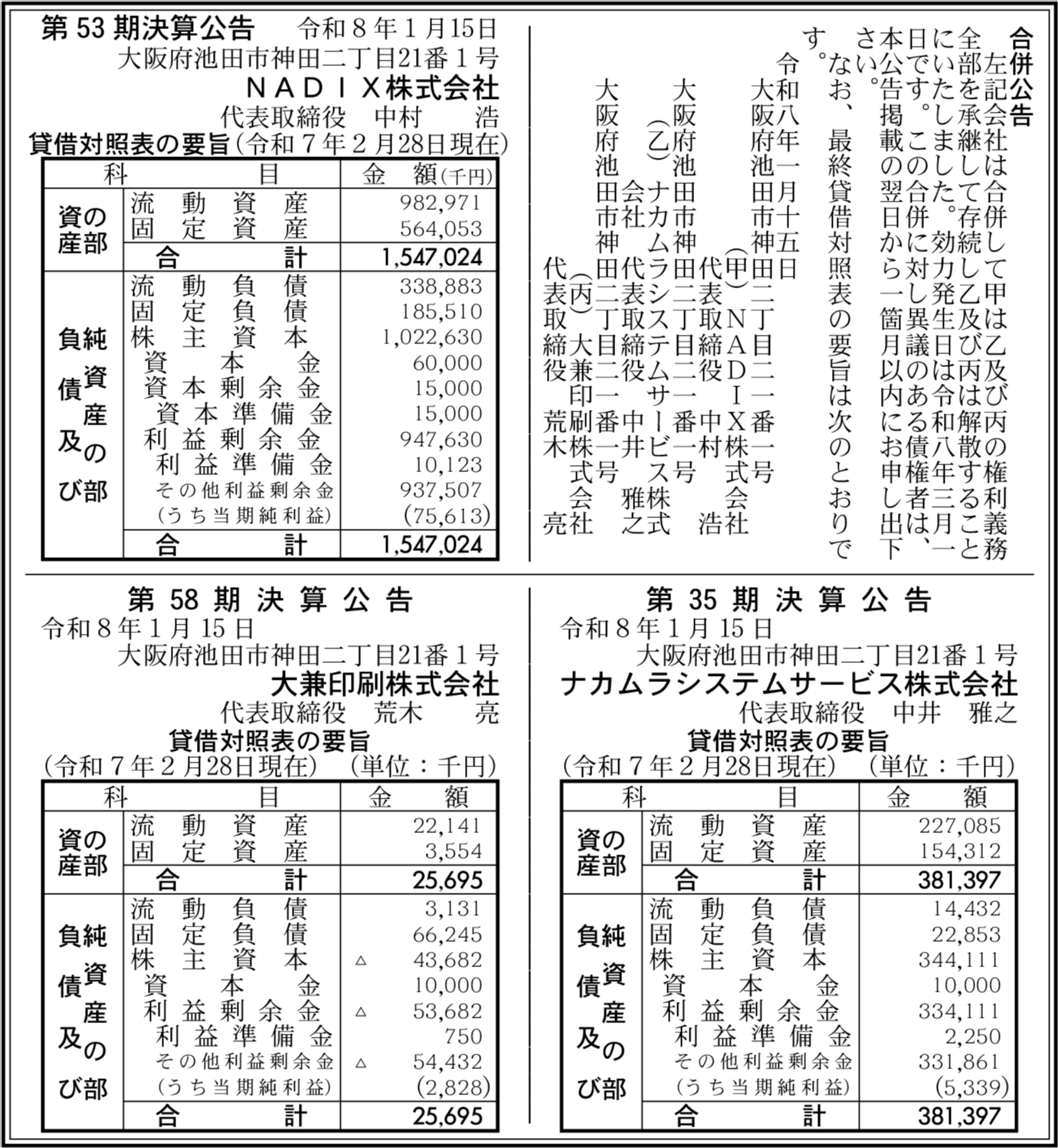 ナカムラシステムサービス株式会社 大阪府池田市 【2025年2月期】 |