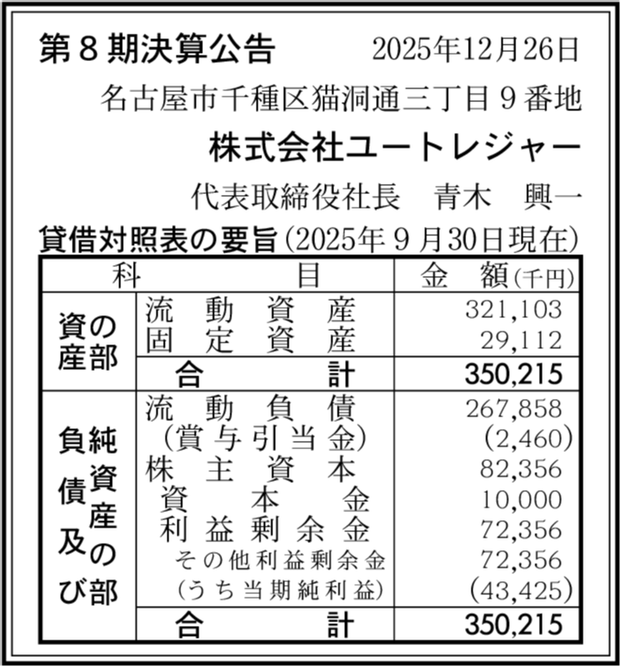 株式会社宝塚コーポレーション 名古屋市千種区 【2025年3月期】 |