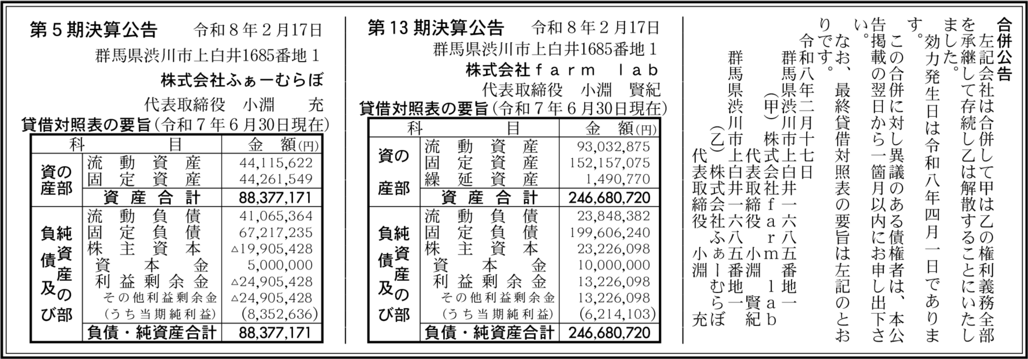 株式会社ふぁーむらぼ 群馬県渋川市 【2025年6月期】 |