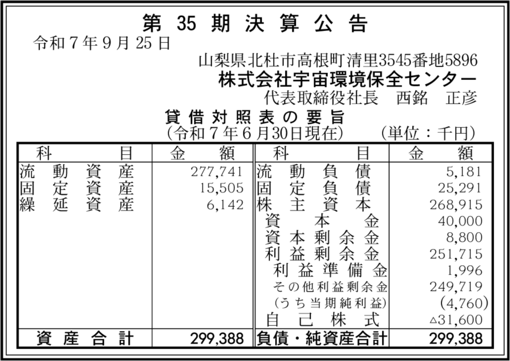 株式会社環境保全研究所 山梨県北杜市 【2025年6月期】 |