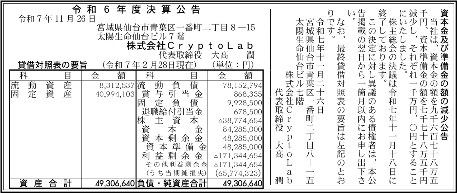 株式会社CryptoLab 宮城県仙台市青葉区 |