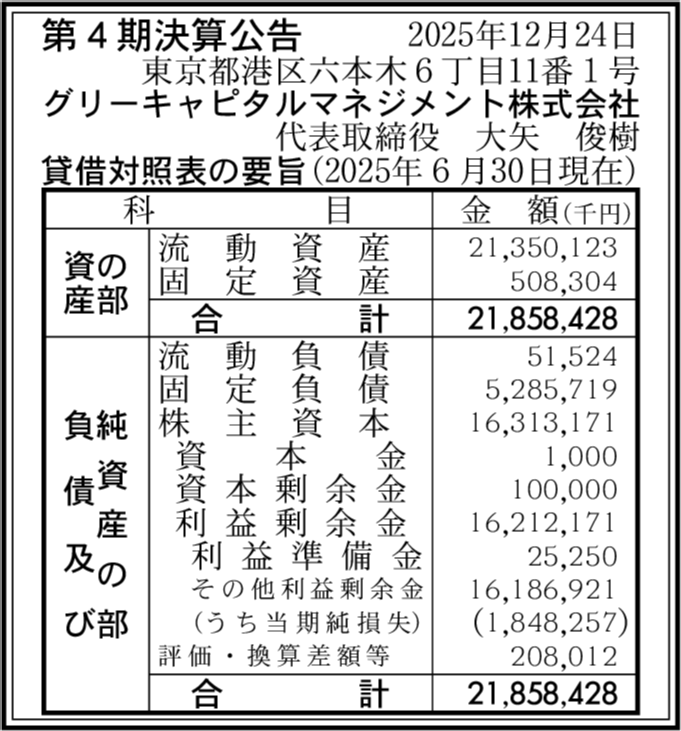 | 会社名 | グリーキャピタルマネジメント株式会社 |