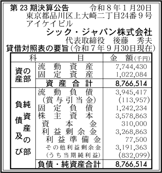 | 総資産 | 87億6,651万4,000円 (▲16.24%) |