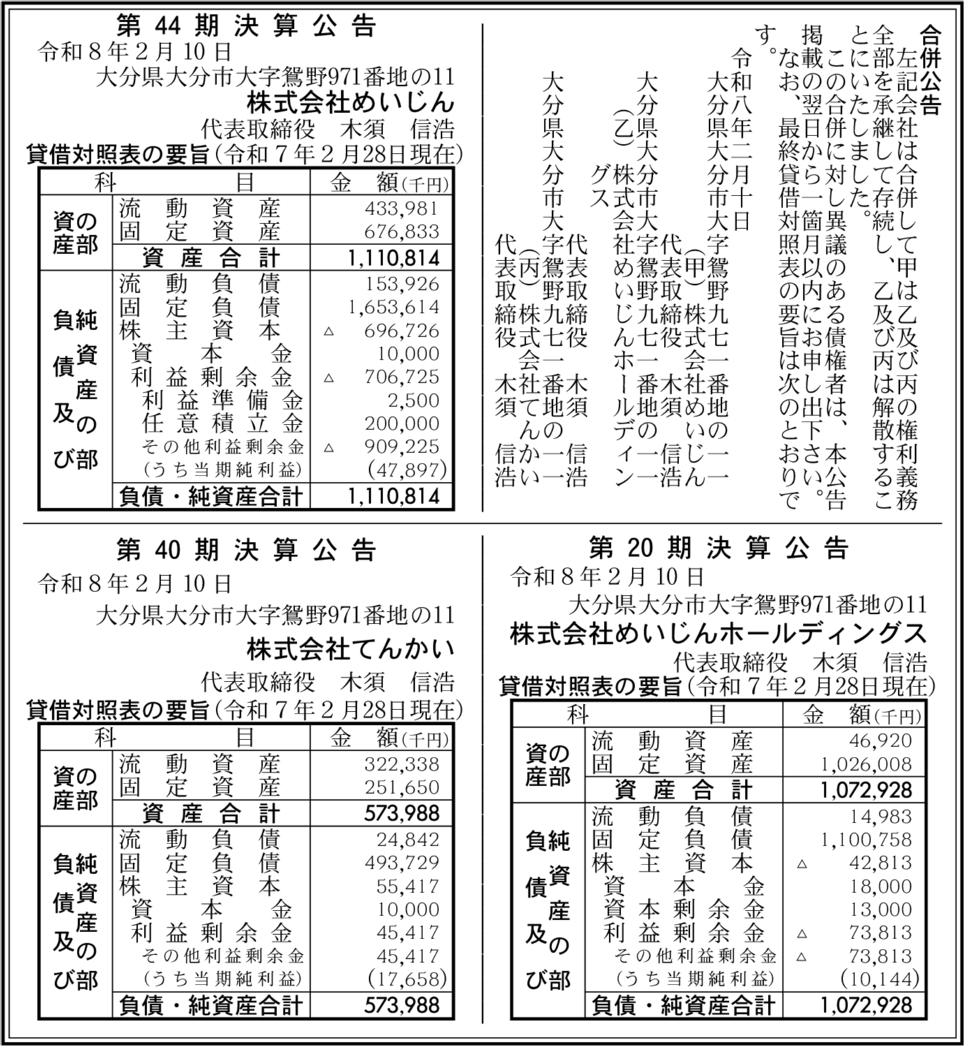 株式会社めいじんホールディングス 大分県大分市 【2025年2月期】 |