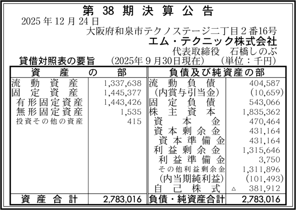 | 総資産 | 27億8,301万6,000円 (▲14.34%) |