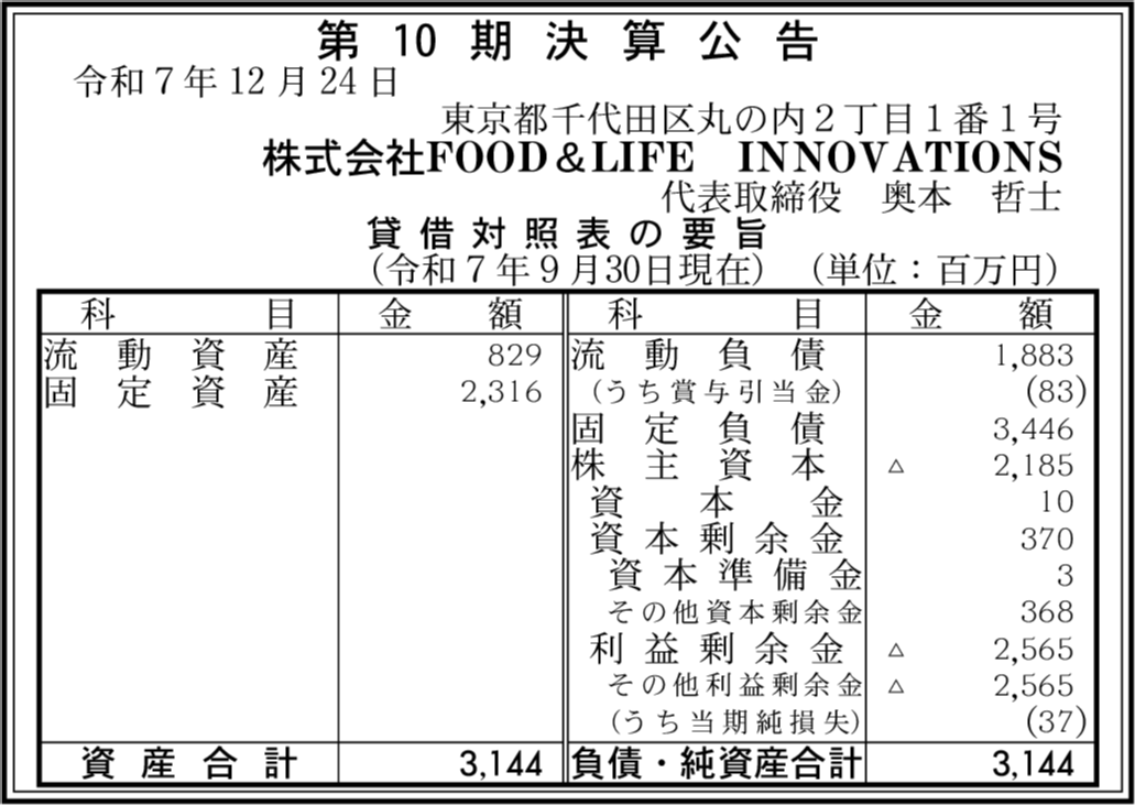 | 会社名 | 株式会社FOOD&LIFE INNOVATIONS |