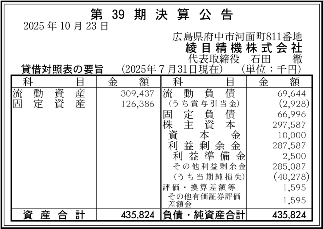 | 会社名 | 綾目精機株式会社 |