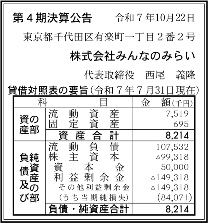 | 利益剰余金 | ▲1億4,931万8,000円 (赤字拡大) |