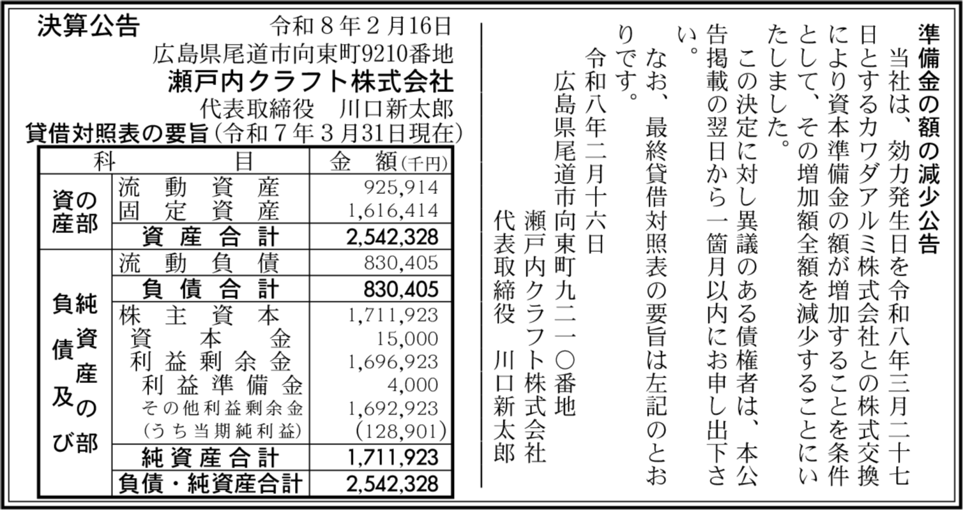 | 会社名 | 瀬戸内クラフト株式会社 |