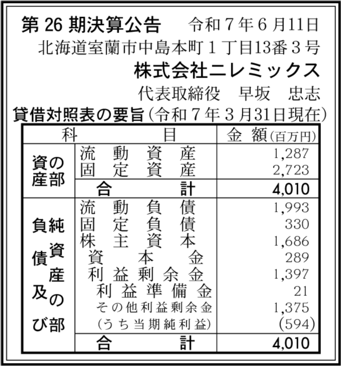 北海製鉄株式会社 北海道室蘭市 【2025年3月期】 |