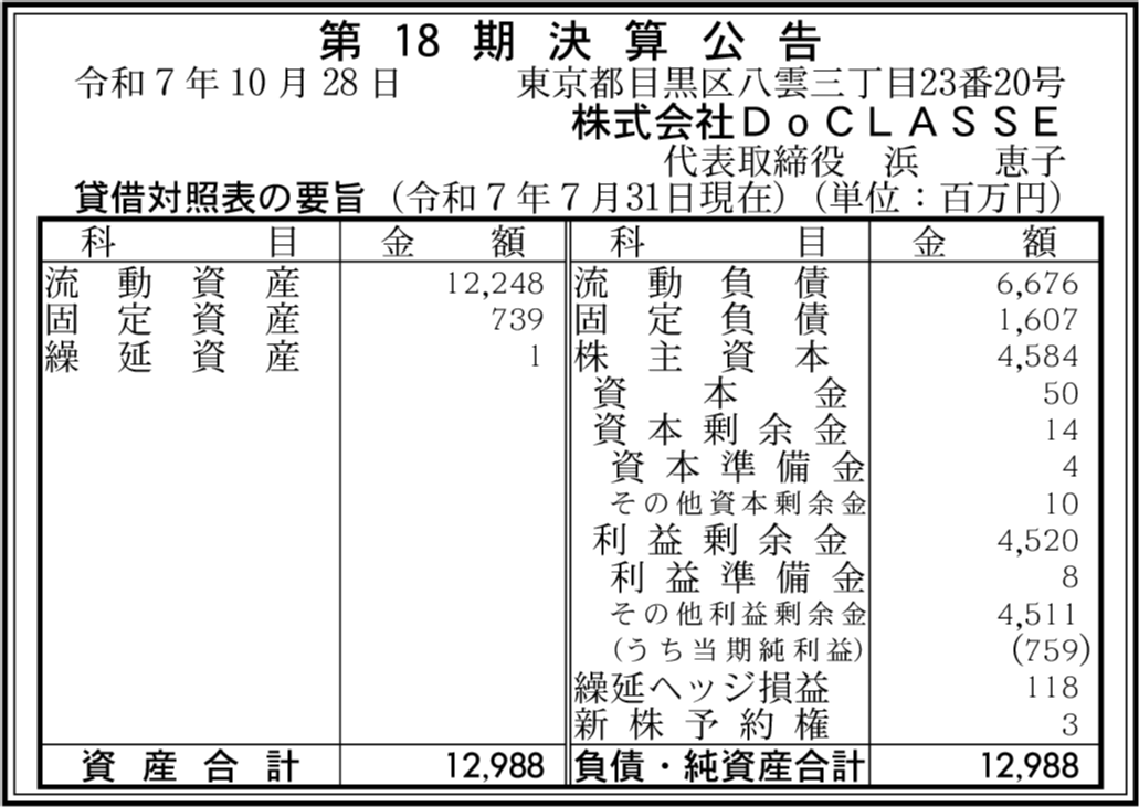 株式会社DoCLASSE the Store閉鎖済み 東京都目黒区 【2021年7月期】 |