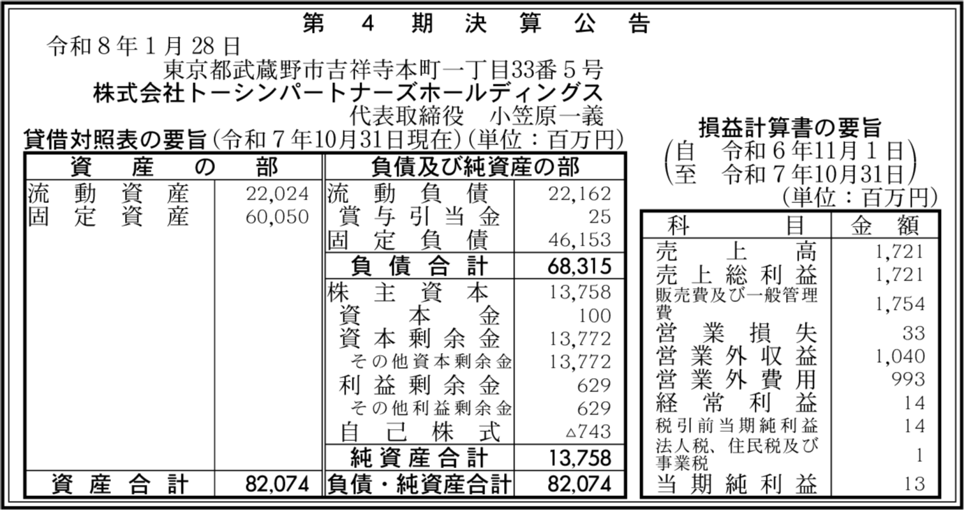 株式会社トーシンパートナーズ 東京都武蔵野市 【2025年10月期】 |
