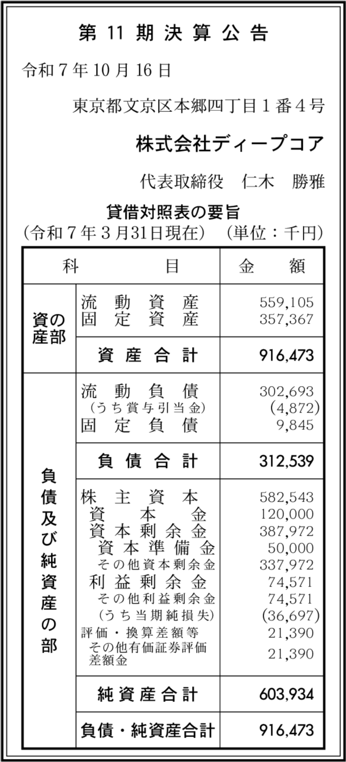 利益剰余金 | 7,457万1,000円 (▲32.98%) |