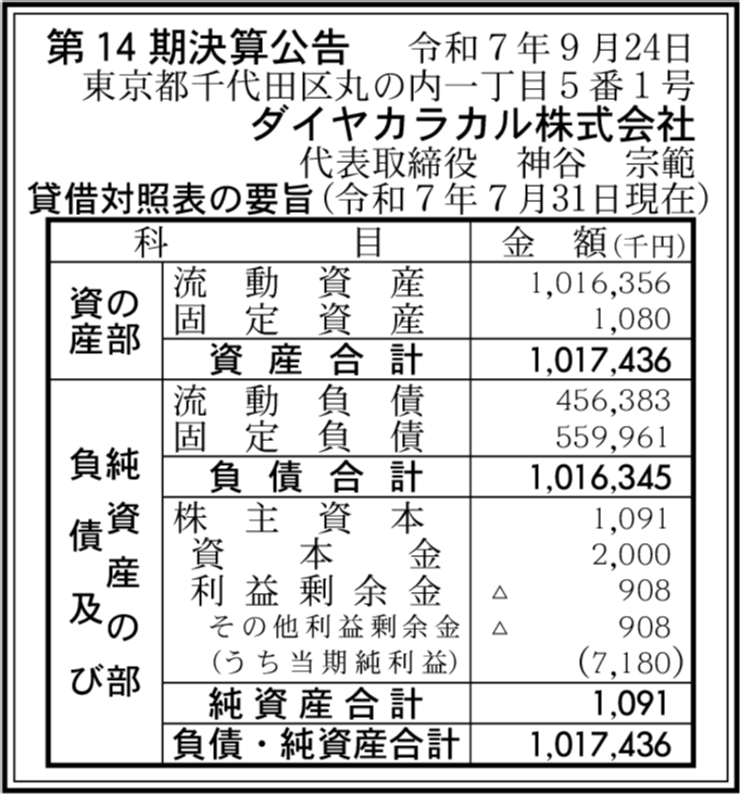 ダイヤピース株式会社 東京都千代田区 【2025年7月期】 |