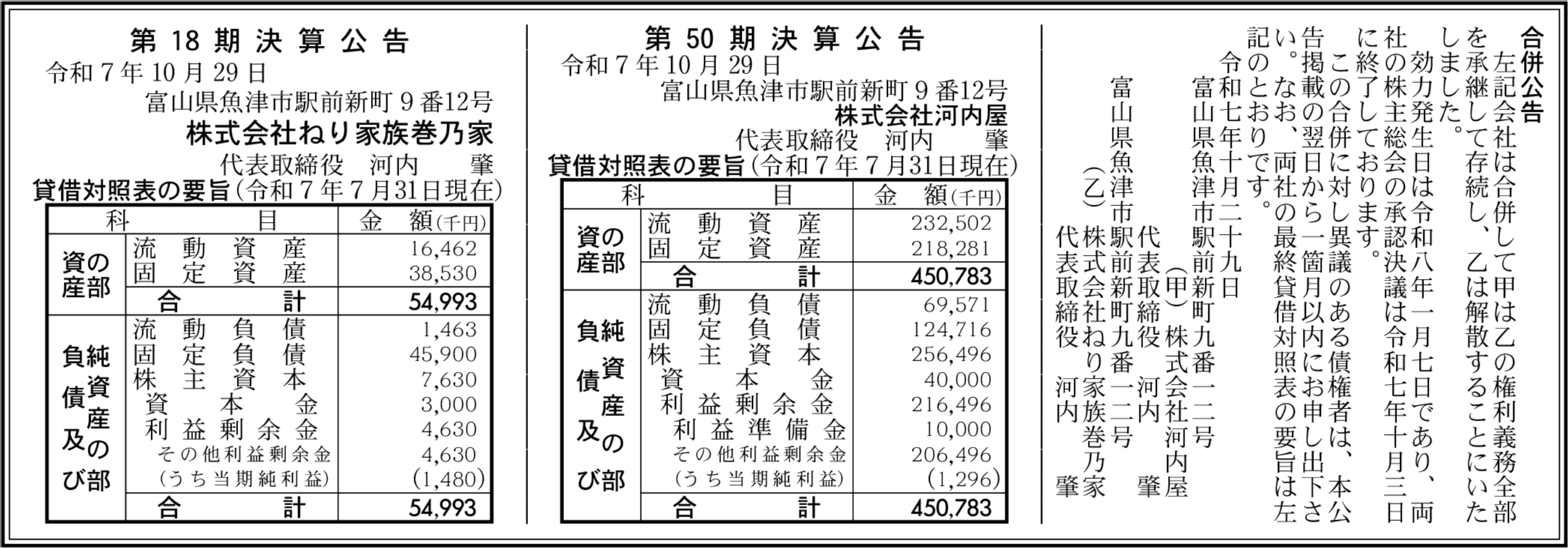 株式会社ねり家族巻乃家 富山県魚津市 【2025年7月期】 |