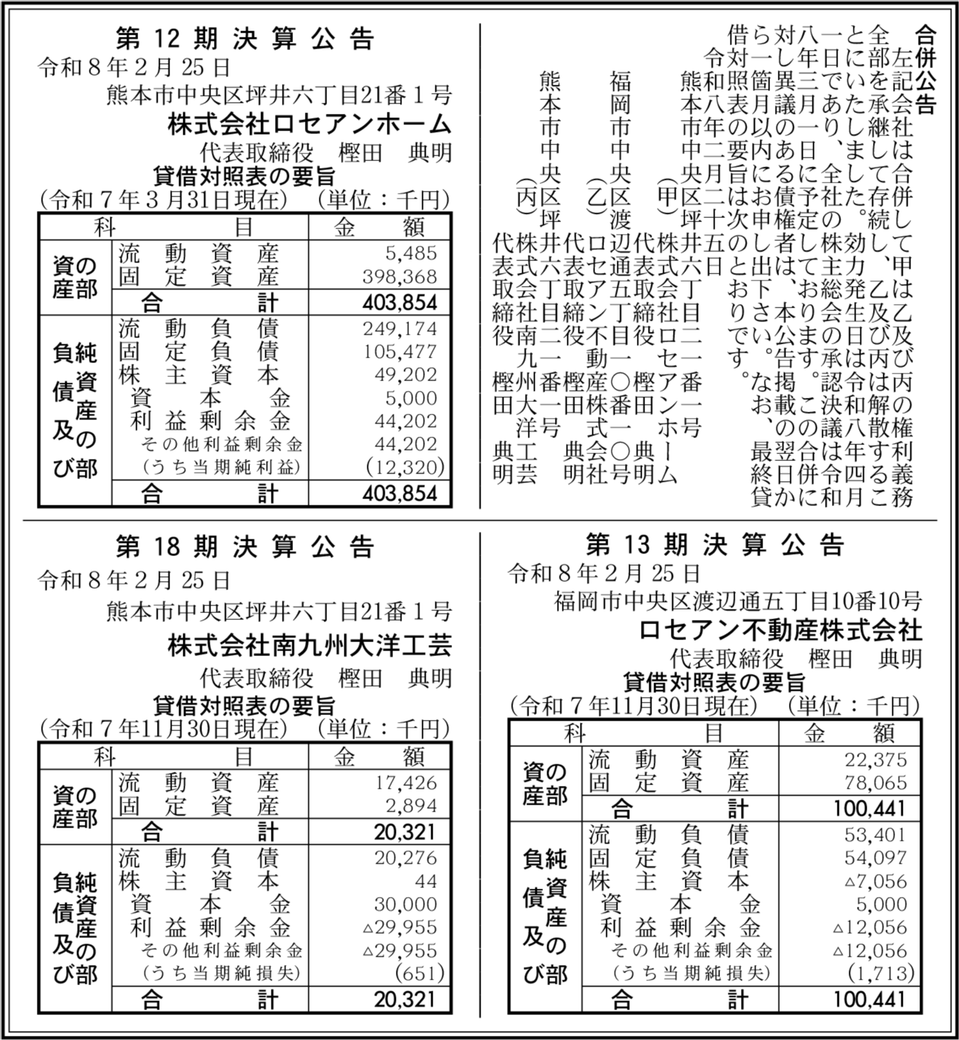 ロセアン不動産株式会社 福岡市中央区 【2025年11月期】 |