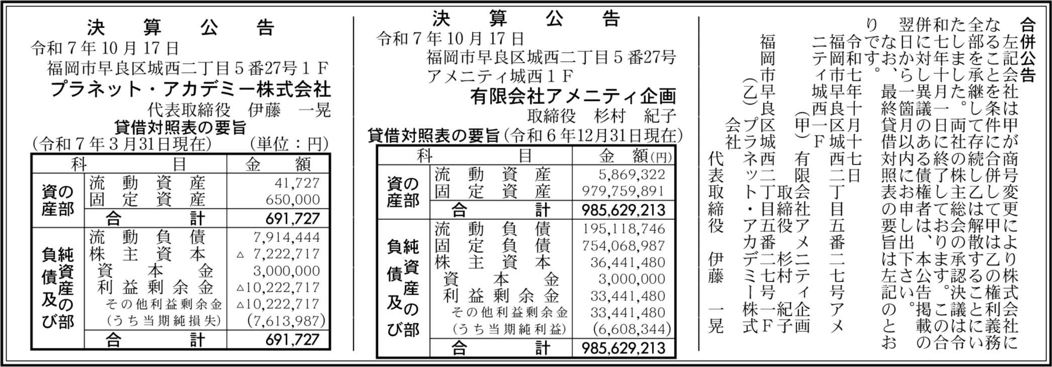 プラネット・アカデミー株式会社 福岡市早良区 【2025年3月期】 |