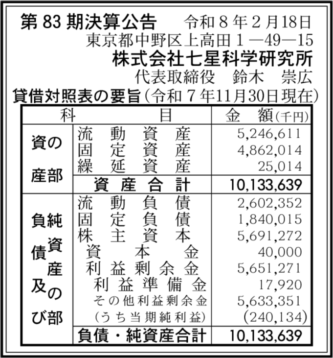 | 会社名 | 株式会社七星科学研究所 |