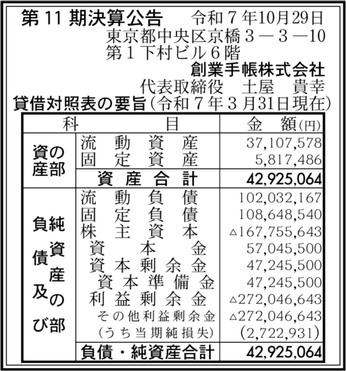 | 株式会社ジュリスター・インターナショナル 東京都中央区 【2024年11月期】 | △83万9,000円 | △265万円 | 1,887万5,000円 |