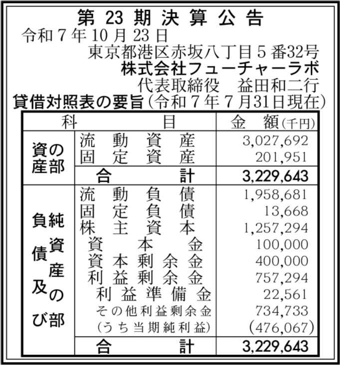 | 株式会社フューチャーラボ 東京都港区 | 4億7,606万7,000円 (+33.1%) | 7億5,729万4,000円 (+169.28%) | 32億2,964万3,000円 (▲24.9%) |