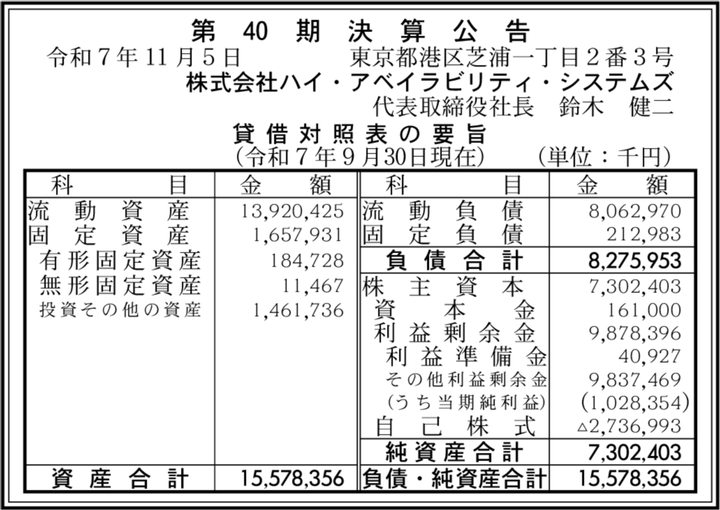 | 会社名 | 株式会社ハイ・アベイラビリティ・システムズ |